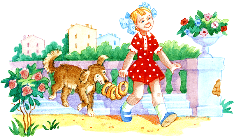Жила девочка Женя. Однажды послала её мама в магазин за баранками. Купила Женя семь баранок: две баранки с тмином для папы, две баранки с маком для мамы, две баранки с сахаром для себя и одну маленькую розовую баранку для братика Павлика. Взяла Женя связку баранок и отправилась домой. Идёт, по сторонам зевает, вывески читает, ворон считает. А тем временем сзади пристала незнакомая собака да все баранки одну за другой и съела: сначала съела папины с тмином, потом мамины с маком, потом Женины с сахаром. Почувствовала Женя, что баранки стали что-то чересчур лёгкие. Обернулась, да уж поздно. Мочалка болтается пустая, а собака последнюю, розовую Павликову бараночку доедает, облизывается.