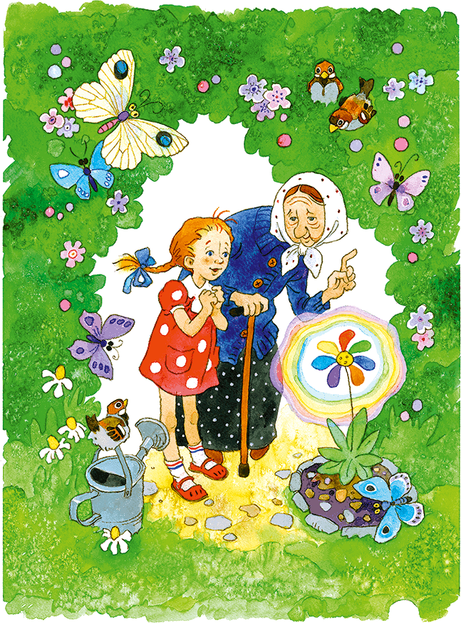 С этими словами старушка сорвала с грядки и подала девочке Жене очень красивый цветок вроде ромашки. У него было семь прозрачных лепестков, каждый другого цвета: жёлтый, красный, зелёный, синий, оранжевый, фиолетовый и голубой.