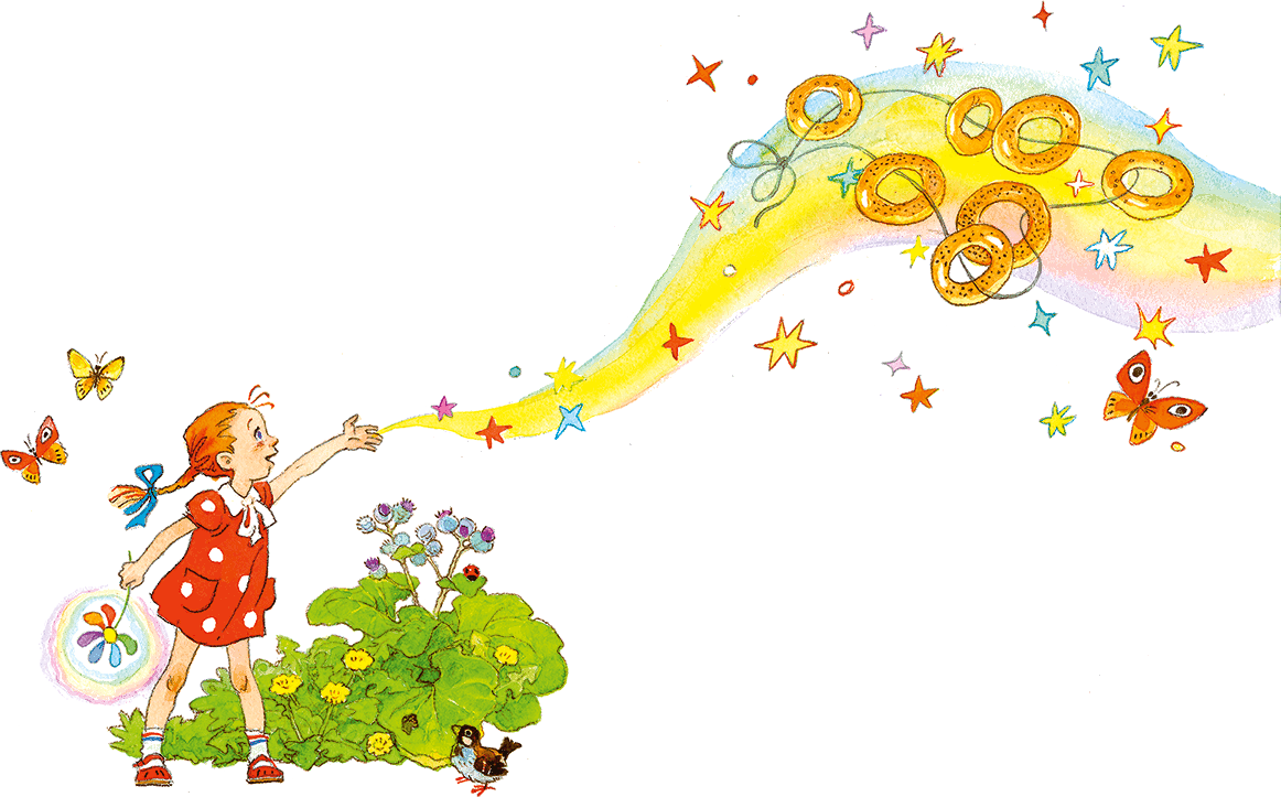 – Ничего, не плачь, я тебе помогу. Правда, баранок у меня нет и денег тоже нет, но зато растёт у меня в садике один цветок, называется – цветик-семицветик, он всё может. Ты, я знаю, девочка хорошая, хоть и любишь зевать по сторонам. Я тебе подарю цветик-семицветик, он всё устроит.