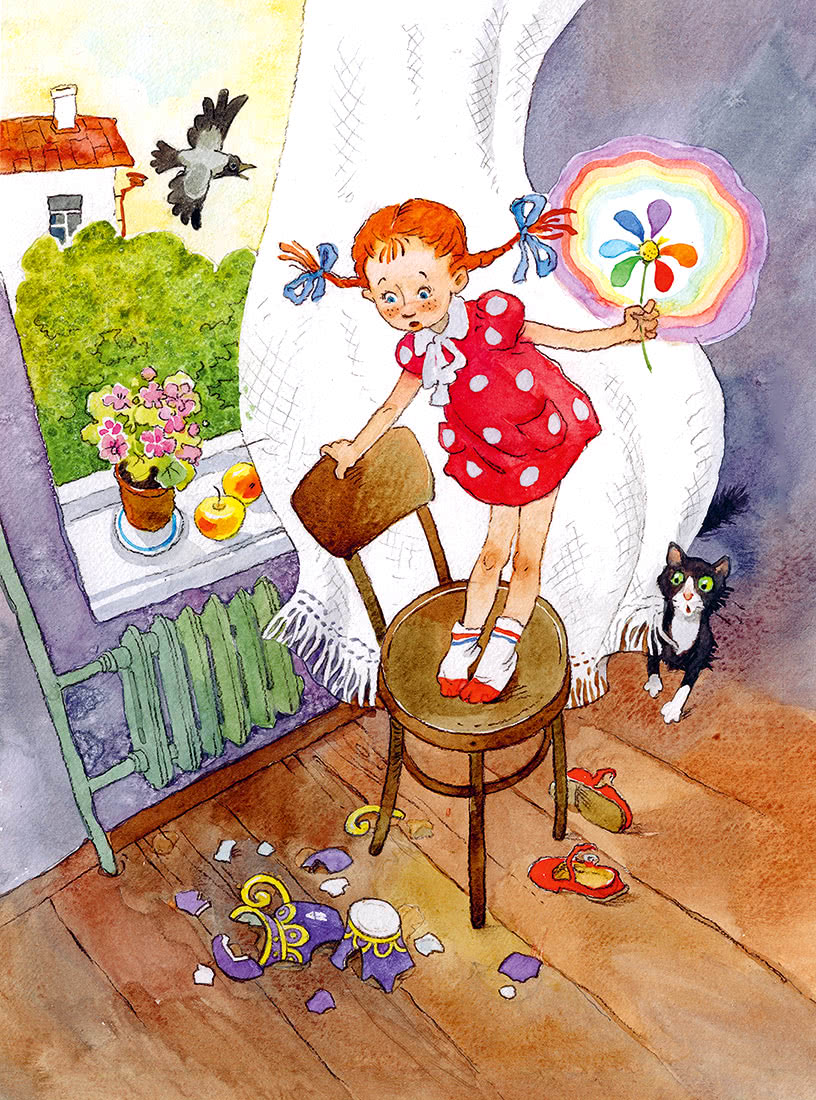 Мама прибежала из кухни – глядь, а её любимая вазочка как ни в чём не бывало стоит на своём месте. Мама на всякий случай погрозила Жене пальцем и послала её гулять во двор.