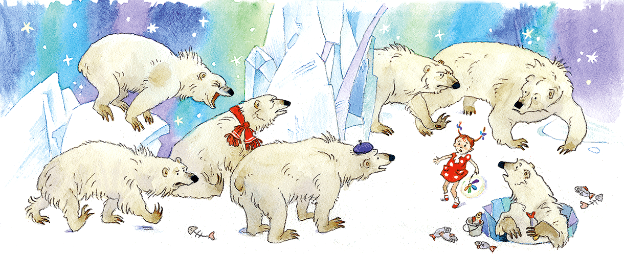 – Ай, мамочка, замерзаю! – закричала Женя и стала плакать, но слёзы тут же превратились в сосульки и повисли на носу, как на водосточной трубе. А тем временем из-за льдины вышли семь белых медведей и прямёхонько к девочке, один другого страшней: первый – нервный, второй – злой, третий – в берете, четвёртый – потёртый, пятый – помятый, шестой – рябой, седьмой – самый большой.