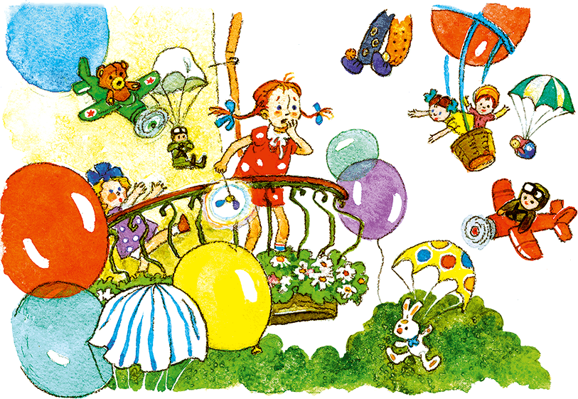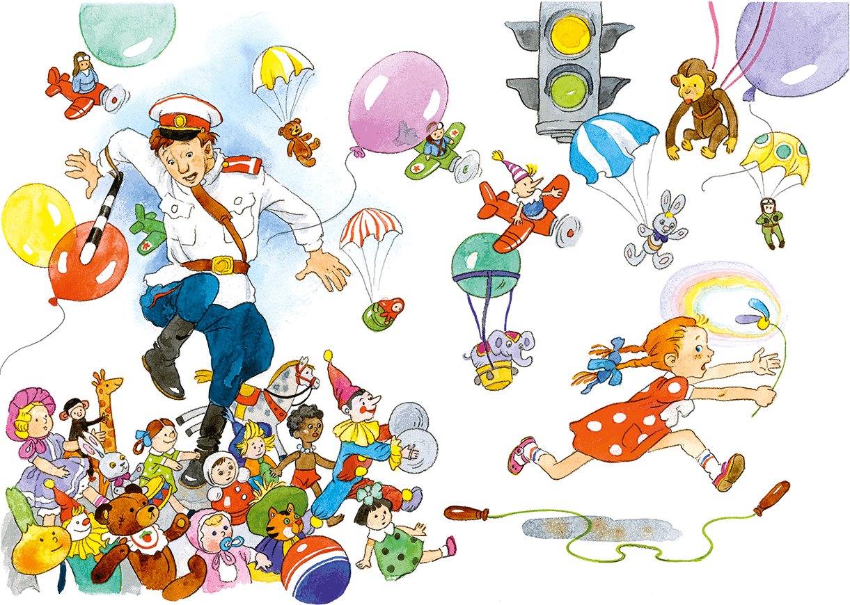 Первыми, конечно, прибежали куклы, громко хлопая глазами и пища без передышки: «папа-мама», «папа-мама». Женя сначала очень обрадовалась, но кукол оказалось так много, что они сразу заполнили весь двор, переулок, две улицы и половину площади. Невозможно было сделать шагу, чтобы не наступить на куклу. Вокруг, представляете себе, какой шум могут поднять пять миллионов говорящих кукол? А их было никак не меньше. И то это были только московские куклы. А куклы из Ленинграда, Харькова, Киева, Львова и других советских городов ещё не успели добежать и галдели, как попугаи, по всем дорогам Советского Союза. Женя даже слегка испугалась. Но это было только начало. За куклами сами собой покатились мячики, шарики, самокаты, трёхколёсные велосипеды, тракторы, автомобили, танки, танкетки, пушки. Прыгалки ползли по земле, как ужи, путаясь под ногами и заставляя нервных кукол пищать ещё громче. По воздуху летели миллионы игрушечных самолётов, дирижаблей, планёров. С неба, как тюльпаны, сыпались ватные парашютисты, повисая на телефонных проводах и деревьях. Движение в городе остановилось. Постовые милиционеры влезли на фонари и не знали, что им делать.