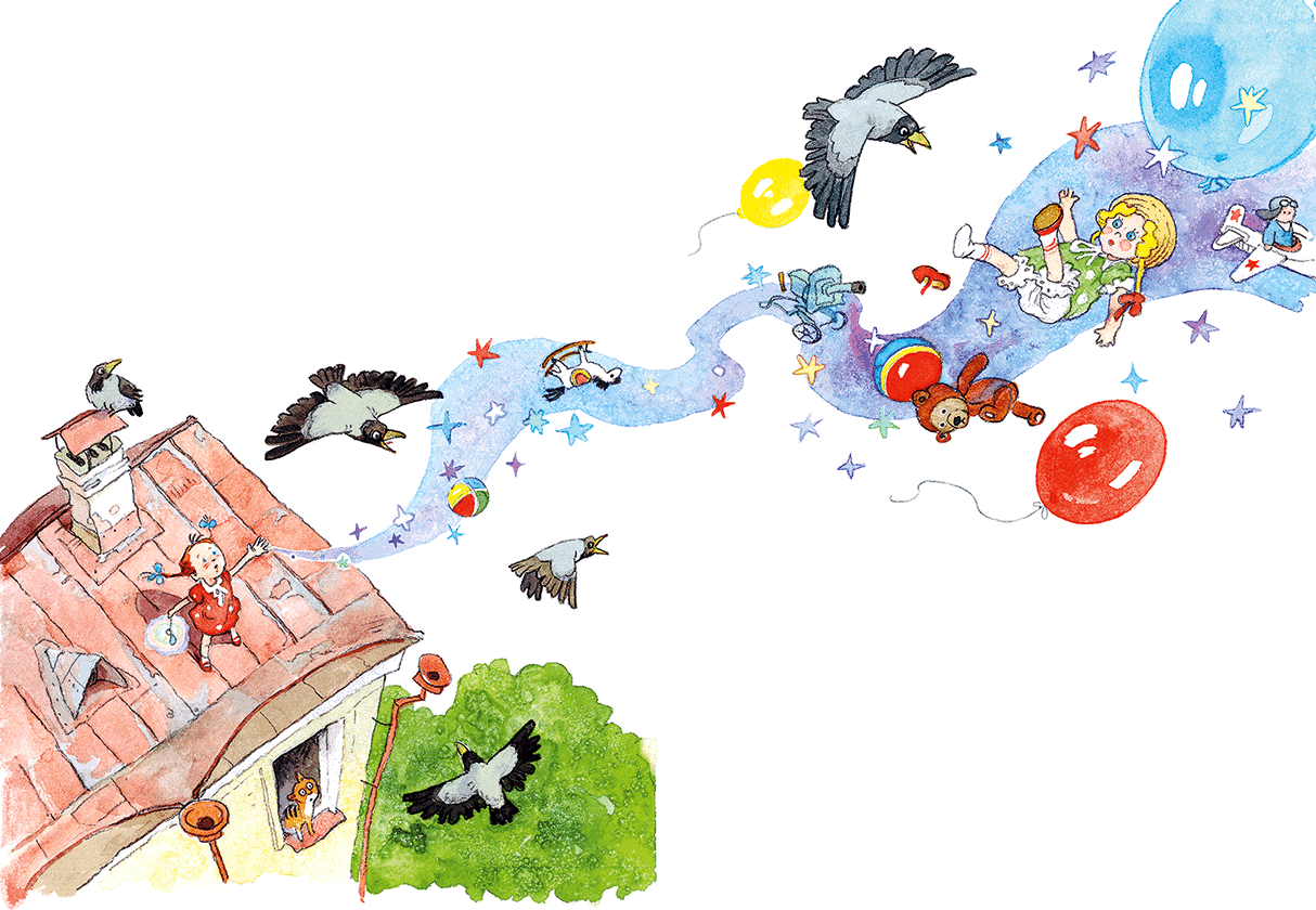 Женя по лестнице – игрушки за ней. Женя на балкон – игрушки за ней. Женя на чердак – игрушки за ней. Женя выскочила на крышу, поскорее оторвала фиолетовый лепесток, кинула и быстро сказала: