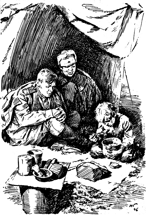 Каждая вещь помещалась на своём месте. Хорошо вычищенные и смазанные салом автоматы висели на жёлтых палочках, изнутри подпиравших палатку. Шинели и плащ-палатки, сложенные ровно, без единой складки, лежали на свежих еловых и можжевёловых ветках. Противогазы и вещевые мешки, поставленные в головах вместо подушек, были покрыты чистыми суровыми утиральниками. При выходе из палатки стояло ведро, покрытое фанерой. На фанере в большом порядке помещались кружки, сделанные из консервных банок, целлулоидные мыльницы, тюбики зубной пасты и зубные щётки в разноцветных футлярах с дырочками. Был даже в алюминиевой чашечке помазок для бритья, и висело маленькое круглое зеркальце. Были даже две сапожные щётки, воткнутые друг в друга щетиной, и возле них коробочка ваксы. Конечно, имелся там же фонарь «летучая мышь».
