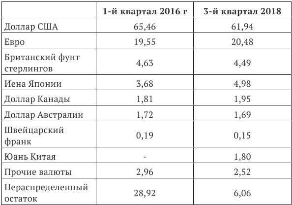 Судя по данным табл. 2, позиции доллара США как резервной валюты за два с половиной года «просели» (снижение его доли на 3,5 процентных пункта). Однако рано говорить о том, что это долговременная тенденция и что доллар США не сумеет в обозримом будущем отыграть некоторое ослабление своих позиций. Напомню, что были годы, когда доля доллара США в совокупных валютных резервах стран-членов МВФ была ниже, чем в конце 3-го квартала 2018 года. Так, в конце 1995 года доля доллара США была 59,0 %; в конце 2012 года – 61,1 %; в конце 2013 года – 61,0 %.