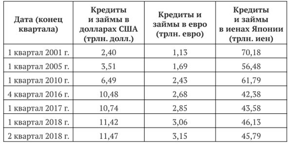Если сравнить цифры по «офшорным» кредитам и займам в долларах США за период с конца 1 квартала 2001 года до середины 2018 года, то их объем вырос в 4,78 раза. По «офшорным» кредитам и займам в евро – в 2,79 раза. А объем «офшорных» кредитов и займов в иенах уменьшился на одну треть. За время нахождения у руля власти Дональда Трампа (с конца 4 квартала 2016 года до середины 2018 года) «офшорные» кредиты и займы в долларах США увеличились на 9,4 %. По аналогичным кредитам и займам в евро прирост составил 11,7 %, а в иенах – 10,8 %. На середину 2018 года объемы трех категорий «офшорных» кредитов и займов в долларовом эквиваленте (пересчет по официальному курсу) были следующими (трлн. долл.):
