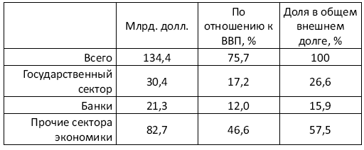 О том, что дамоклов меч дефолта навис не только над государством, но и над всей экономикой страны свидетельствует, в частности, таблица 15.1., дающая представление об общем внешнем долге Украины. Оказывается общий внешний долг страны почти в 4 раза превышает внешний государственный долг. 73,4 % внешнего долга Украины приходится на частный сектор экономики, в абсолютном выражении это 104 млрд. долл. Внешний долг частного сектора складывается из обязательств по банковским кредитам и корпоративным евробондам. Сейчас рыночная стоимость таких бондов резко снизилась при одновременном росте доходности (плата за возросший риск).