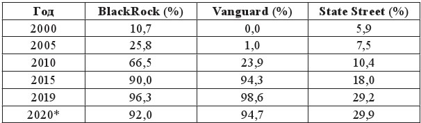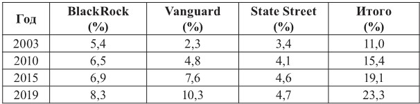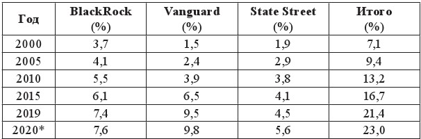 За период 2000–2020‐х гг. доли всех трех компаний «Большой тройки» увеличивались: у BlackRock – с 3,7 до 7,6 процентов (в два с лишним раза); у State Street – с 1,9 до 5,6 процентов (почти в три раза); у Vanguard – с 1,5 до 9,8 процентов (в 6,5 раза). В результате на сегодняшний день по участию в акционерном капитале группы S&P 500 на первом месте оказалась компания Vanguard; на втором – BlackRock; на третьем – State Street. В совокупности участие «Большой тройки» в акционерном капитале группы S&P 500 приближается к одной четверти.