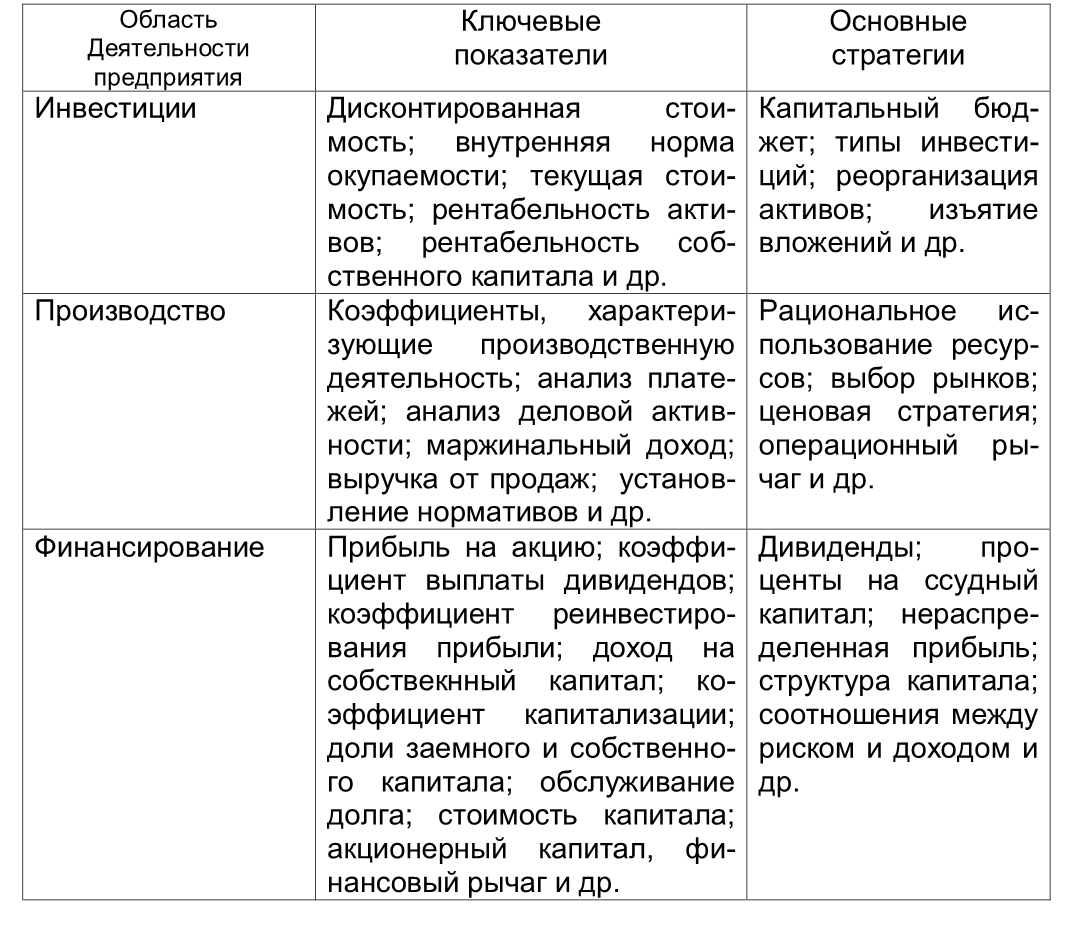 Каждой из областей деятельности предприятия – инвестиции, производство, финансирование – соответствует свой набор ключевых (оценочных) показателей и стратегий, которых придерживаются менеджеры (таблица 2.1).24