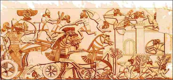 Необычайно жестокий царь Ашшурнасирапал II (883–859 г.г. до н. э.) с огнем и мечом прошел по Мессопотамии и Сирии, грабя до опустошения, почти поголовно истребляя жителей местностей, в которых проявлялось малейшее неповиновение. По пути создавал крепости с запасами провианта и фуража для войска. Активную часть населения, связанную с прежней властью, истреблял (сдирал кожу, сажал на кол, складывал связанными в живые пирамиды, обезглавливал), остальных превращал в рабов. В 876 г. до н. э. прошел до финикийского побережья. Преемники продолжали эту политику. Но когда Салманасар III в 853 г. до н. э. двинулся в большой поход на Сирию, против него выступило организованное сопротивление южного сирийского союза во главе с Дамаском – более десятка государств Сирии, Палестины, Финикии и Киликии. Их поддержали арабы и, возможно, Египет. Сражение
