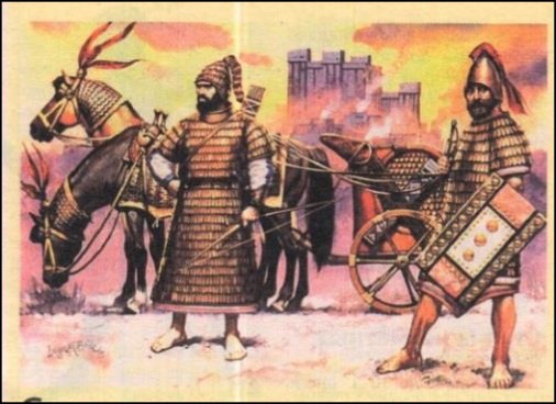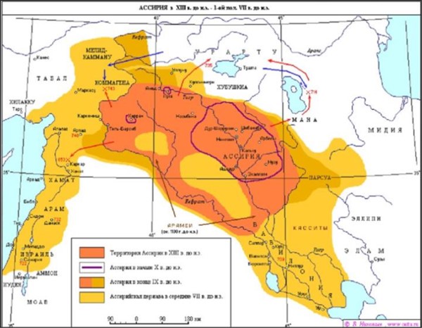 у крепости Каркар, по-видимому, закончилось поражением Ассирии, так как после этого 8 лет она не смела совершать походы на Сирию. В 845 г. до н. э. ассирийский царь созвал общее ополчение в 120000 чел. и выступил против Сирии, но снова без успеха. Лишь в 841 г. до н. э., воспользовавшись временным распадом южного сирийского союза, он разбил Дамаск, проник в Финикию и установил свою гегемонию в Сирии. Потом на Сирию Ассирия не ходила походами более трех десятков лет и лишь при правившей за малолетнего сына Саммурамат (ошибочно считавшейся позже женой вавилонского Навуходоносора – Семирамидой) был совершен ряд походов в Сирию и на Восток (достигли Каспийского моря). После ряда столкновений с Урарту (в 781–778 г.г., 776 г., 774 г. до н. э. в долине реки Диялы, уже на Вавилонской по существу территории) окраинные области, подчиненные Ассирии, то там, то здесь постепенно переходят под власть Урарту. Ассирия была отрезана от месторождений железа и от Сирии. С 745 г. до н. э. Ассирией правит новый царь Тиглатпаласар III. Проведя реформы в управлении хозяйством на завоеванных территориях и в армии (ввели много конницы, использовали железное наступательное оружие, повысили искусство возведения понтонов, лагерей с крутым валом, осадных насыпей, таранов и т. д.; была хорошая организация разведки), Тиглатпаласар III в 743 г. до н. э. нанес поражение Урарту, в течение 10 лет пересек почти всю территорию Урарту и захватил значительную часть Северной Сирии. Затем в течение 3-х лет покорил Финикию и филистимлян, центральную и южную Сирию. В союзе с иудейским царем Ахазом разбил поодиночке Израиль, затем Дамаск (в 732 г. до н. э.), казнив царя и уведя население в плен. В 729 г. до н. э. он стал номинальным царем Вавилонии, оставив ей самоуправление. Сын Тиглатпаласара III – Салманасар V (727–722 г.г. до н. э.) отменил самоуправление Вавилонии и Ашшура, снова ввел подати на этих территориях. Во время его похода на Израиль и осады Самарии жреческая рабовладельческая знать возвела на престол его сводного брата Саргона II (722–705 г.г. до н. э.).
