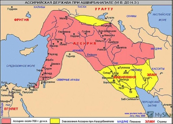 Дербентский проход устремились на территорию нынешнего Азербайджана, где обосновались, включив, вероятно, в свой состав значительные группы местного скотоводческого населения и совершая походы в различные части передней Азии). В 679 г. до н. э. он сразился с киммерийскими отрядами, но это не привело к восстановлению власти в бывших северных территориях Ассирии. Царь Тира Баал, заключивший договор с Ассирией, перешел на сторону Тахарки – эфиопского фараона Египта. Из-за этого начинается длительная серия войн Ассирии с Египтом. В 676 г. до н. э. ассирийское войско совершило бесполезный поход в Южную Аравию, не рассчитав силы и расстояние. В 675–672 г.г. до н. э. – война с Египтом. В 673–672 г.г. до н. э. Ассирия покоряет полунезависимую горную Шубрию, захватив беглых рабов, бежавших туда из Ассирии и вернув беглых рабов из Урарту царю Урарту. Восстали мидяне и другие союзничающие со скифами племена на восточных окраинах державы; три восточные области отпали от Ассирии, образовалось царство Мидия. В 671 г. до н. э. Ассирия захватывает египетский Мемфис и закрепляется в Нижнем Египте. Египетские власти оставлены на своих местах под подчинением небольшому гарнизону ассирийских «надзирателей». На Египет наложили ежегодную дань в 180 кг золота и 9 т серебра. При сыне Асахарддона – Ашшурбанапале Тахарки снова попытался овладеть Египтом, но ассирийцы не только отбросили его, но и прошли далеко вверх по долине Нила и разграбили древнюю столицу Египта Фивы.