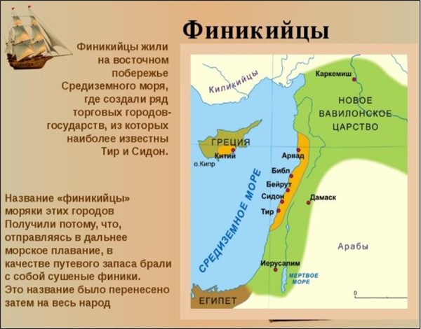 Страна находилась в узкой приморской полосе вдоль северной части восточного побережья Средиземного моря, ограниченной с востока Ливанскими горами. Наряду с проживавшими здесь несемитическими племенами с III тысячел. до н. э. здесь появляются и семитические племена той же группы западно-семитических племен, которые тогда заселяли Палестину. Их языки почти тождественны. Название Кинаххи или, по греческому тексту Библии, Ханаан более обширно и включает также Палестину и отчасти Сирию. Долгое время осевшие племена жили в условиях первобытно-общинного строя, но с конца III тысячелетия до н. э. втягиваются в оживленную международную торговлю, особенно обширную с Египтом, и образуют союз небольших рабовладельческих портовых городов-государств (Угарит, Арвад, Библ, Сидон, Тир и др.). Финикийцы искусно строили торговые и боевые корабли (название финикийских кораблей «галера» используется до сих пор), первыми стали использовать рабов в качестве гребцов на судах. Финикийские корабли ходили в далекие плавания. Впоследствии финикийцы основали в Африке колонию Карфаген, которая превратилась в мощное государство, соперничающее с Римом.