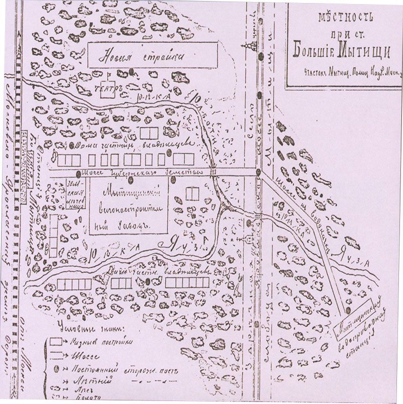 План поселка близ платформы Большие Мытищи. Составлен в Московском уездном полицейском управлении в связи с разработкой схемы расположения сторожевых постов. (Пристав третьего стана Московского уезда, коллеж, асессор М. Ф. Цветаев, 1908 год)