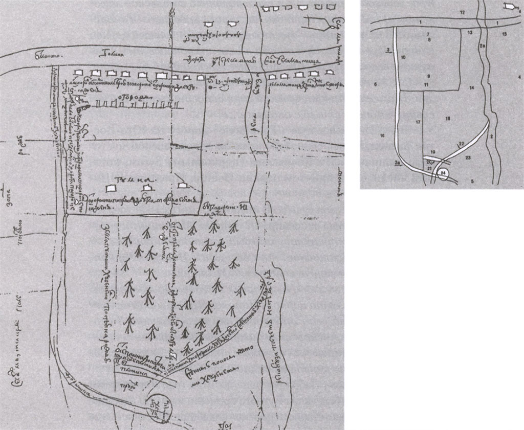 Как же выглядели эти села в XV, XVI, XVII веках? – Увы, никто тогда еще не писал картин и не делал гравюр по мотивам мытищинских мест. Не существовали еще службы: топография, геодезия и картография. Но до нас дошли так называемые планы-рисунки местностей. Самый древний план-рисунок (без масштаба) Москвы был составлен Герберштейном[4]. Всего в исторических архивах Москвы сохранилось около 250 таких планов: Годунова (Петров-чертеж)[5], Массы[6] и других авторов.