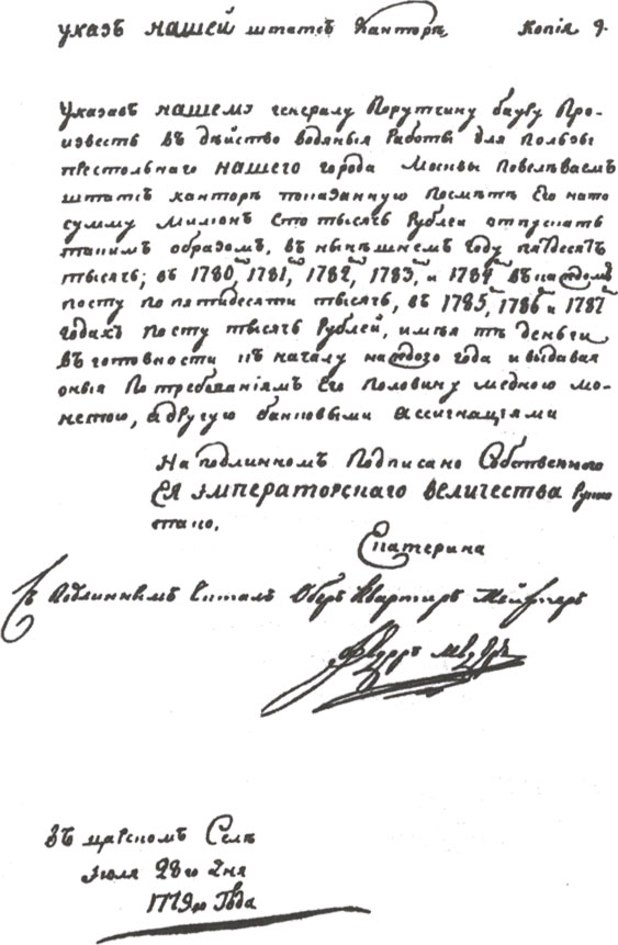 Указав нашему генералу-порутчику Бауру произвесть в действо водяные работы для пользы престольного Нашего города Москвы, повелеваем штате-конторе показанную по смете Его на то сумму милиен сто тысяч рублей отпустить таким образом. В нынешнем году пятьдесят тысяч, в 1780-м, 1781-м, 1782-м, 1783-м и 1784-м, в каждом по сту по пятидесяти тысяч рублей, в 1785-м, в 1786-м и 1787 годах по сту тысяч рублей, имея те деньги в готовности к началу каждого года и выдавая оные по требованию Его, половину медною монетою, а другую банковыми ассигнациями.