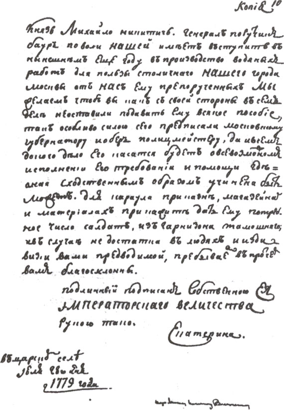 «Князь Михаила Никитич. Генерал-порутчик Баур по воле нашей имеет вступить в нынешнем еще году в производство водяных работ для пользы столичного Нашего города Москвы, от Нас Ему препорученных. Мы желаем, чтобы Вы пане со своей стороны в сем деле не оставили подавать Ему всякое пособие, так особливо силою сего предписали Московскому губернатору и обер-полицмейстеру, да и всем данного дела Его касаться будет о всевозможном исполнении Его требований и помощи, где оная сходственным образом учинена быть может.