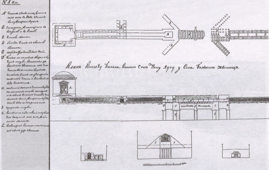 Чертеж отрезка водопровода у села Большие Мытищи: павильон над бассейном недалеко от Ярославского шоссе, конструкция переборки водовода через реку Яуза. 1783 год. (РГВИА. Ф. ВУА.Д.24466)