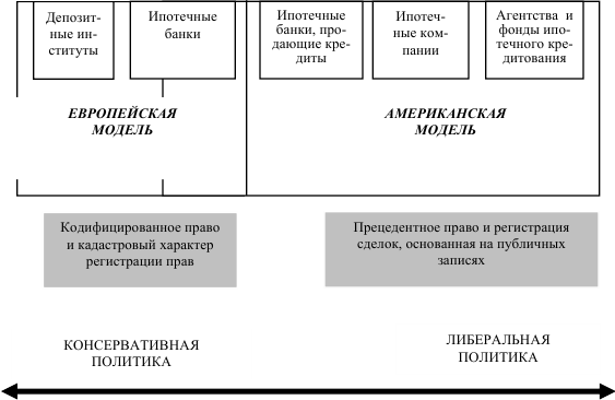 При детальном анализе европейская и американская модели имеют более глубокие, чем наличие или отсутствие тех или иных ипотечных институтов, различия. Можно утверждать, что в основе европейской модели лежит консерватизм, направленный к максимальной надежности ипотечных институтов. Например, за более чем 100 лет действия немецкого Закона об ипотечных банках не обанкротился ни один ипотечный банк. С другой стороны, американская модель основана на либерализме в рыночных механизмах. Она характеризуется динамизмом своего развития, сопровождаемого как взлетами, так и кризисами, и связанными с поисками путей выхода из него финансовыми новациями.