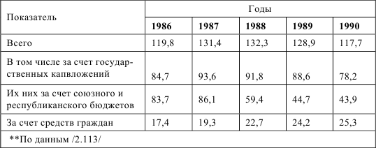 С началом горбачевских реформ динамика ввода жилья претерпела определенные изменения. После резкого увеличения в 1987 г. начался спад, который продолжается до сих пор. При этом доля государственного финансирования неуклонно уменьшалась (см. табл. 2.2).