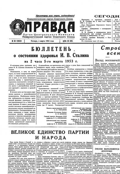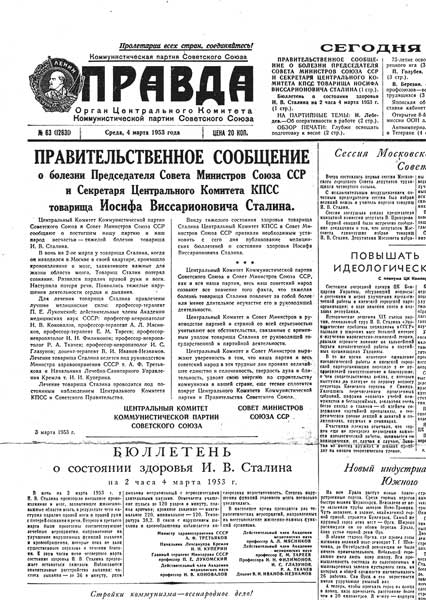 Ввиду тяжелого состояния здоровья товарища Сталина Центральный Комитет КПСС и Совет Министров Союза ССР признали необходимым установить с сего дня публикование медицинских бюллетеней о состоянии здоровья Иосифа Виссарионовича Сталина.