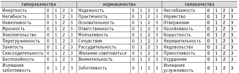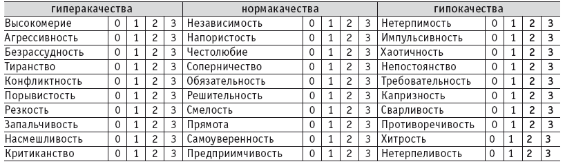 Однажды Виктор Гюго сказал: «У каждого человека три характера: тот, который ему приписывают; тот, который он сам себе приписывает; и, наконец, тот, который есть в действительности». Поэтому для того чтобы получить достоверный результат тестирования, необходимо произвести перекрестный опрос. В эксперименте участвуют два хорошо знакомых друг другу человека. Тест заполняется дважды: первый раз на себя самого, второй раз – на вас вашим знакомым. Предлагается отметить черты, которые у вас имеются. Значение баллов: 0 – такой черты нет, 1 – такая черта вроде бы есть, 2 – такая черта достаточно выражена, 3 – такая черта сильно выражена. При обработке теста ответы суммируются и усредняются из них только совпадающие. Несовпадающие ответы опускаются.