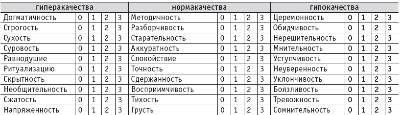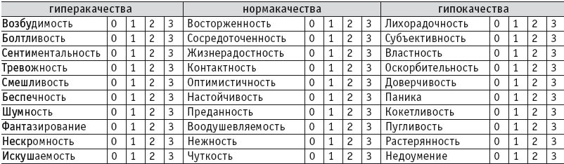 Средне выражены черты: гипер – возбудимость, смешливость, фантазирование, раздумывание, отстраняемость, невозмутимость; норма – обязательность, прямота, самоуверенность; сосредоточенность, настойчивость, чуткость, практичность, основательность, внимательность, методичность, старательность, аккуратность, сдержанность, тихость; гипо