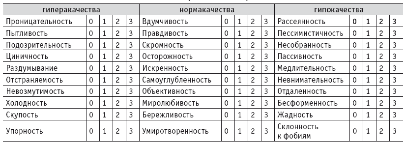 Очень сильно выраженные черты: гипер – скрытность; норма – преданность, самоуглубленность, осторожность; гипо – требовательность;