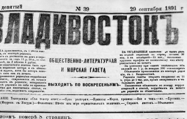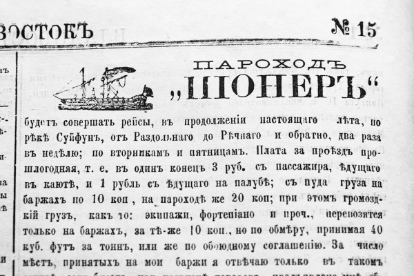 Вот типичное объявление из газеты «Владивосток» от 19 апреля 1887 года: «СПРАВОЧНЫЙ ЛИСТОК. Пароходное сообщение между Владивостоком и устьем реки Суйфун началось со вторника, 14 апреля, и будет производиться пароходом «Амур» два раза в неделю: по вторникам и пятницам, с заходом раз в неделю по пятницам, при возвращении с Речного, к устью р. Мангугай. Из Владивостока пароход выходит в 6 часов утра».