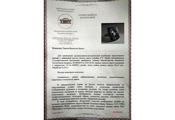 Всё началось с того, что известный в Беларуси и за рубежом деятель искусств подарил своей приятельнице, потомственной российской графине, кольцо-печатку с изображением на камне халцедоне в технике углублённого рельефа (инталия) мужчины в профиль в рыцарских доспехах и в шлеме, украшенном плюмажем из птичьих перьев, со словами: «Носи, Аллочка, ты такое любишь». Вещь ювелирная и на первый взгляд старинная вызвала у получателя подарка, моей тёщи, естественный вопрос: «Откуда оно?». Даритель ответил кратко: «Досталось от знакомого, известного в Москве и за пределами СССР, побывавшего полстолетия назад с деловым визитом в Милане, который сказал, что это Сфорца». Тёща изредка надевала подарок, отправляясь на какие-нибудь торжественные мероприятия или в гости к приятельницам. Везде кольцо-печатка вызывало интерес, в том числе и в Эрмитаже, где она с дочерью неоднократно бывали на экскурсиях. После смерти тёщи дочь кольцом-печаткой практически не пользовалась. Её предки были членами Российского Дворянского Собрания. Сама дочь, как член Белорусского Республиканского общественного объединения «Собрание наследников шляхты и дворянства», на отдельные мероприятия надевала кольцо-печатку. Больше оно лежало в шкатулке с другими женскими украшениями.