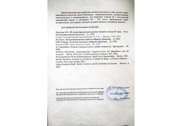 Вскоре я получил из Эрмитажа сообщение: «В ответ на Ваше письмо о перстне с инталией сообщаем, что, к сожалению, Государственный Эрмитаж не правомочен проводить экспертизу предметов, не входящих в его коллекцию, и предоставлять консультации по вопросам таких предметов. Вы можете обратиться в центры экспертизы в Вашем городе».