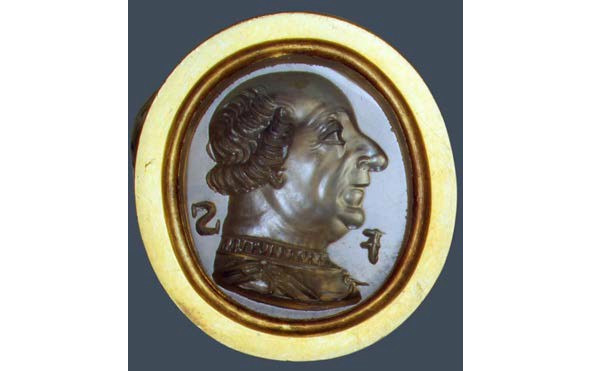 Благо, что специалистов такого уровня в Милане было, как говорится, «раз, два и обчёлся». Два выдающихся придворных ювелира того времени Энзоло Джиан Франческо (1430—1513) и Кородоссо Фоппо (1452—1527) попали в поле нашего зрения при ознакомлении с их великолепными миниатюрными портретами герцогов Милана Франческо Сфорца (1401—1466) и Лодовико Сфорца (1452—1508), выполненных на халцедоне в технике углублённого рельефа (инталия). Эти работы находятся в Эрмитажном собрании коллекций (инв. номера И-3630, И-3633). Стало интересным установить причастность этих мастеров к имеющемуся кольцу-печатке, изготовленному из того же материала, по той же технологии, но несколько меньшего размера (2,2х1,5 см), нежели миниатюрные портреты герцогов Миланских в профиль: Франческо Сфорца размером 2,3х2,0 см и Лодовико Сфорца размером 3,9х3,2 см.