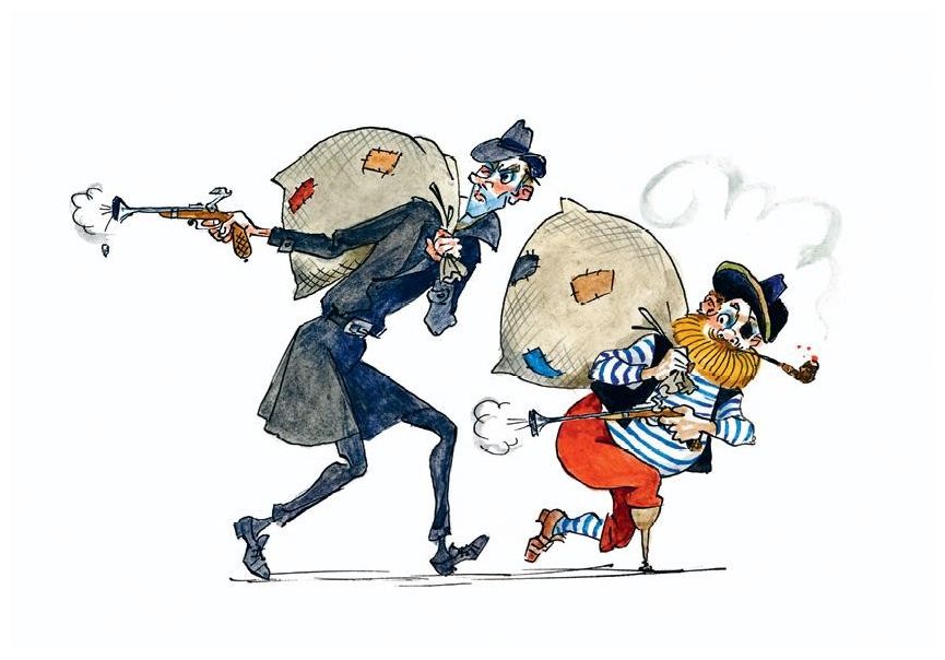 – Подхватываем мешки и уносим ноги! За нами, конечно, организуют погоню со стрельбой, но мы скроемся. Никто нас не поймает и не найдёт! А на следующий день во всех газетах об этом напишут. И мы станем самыми знаменитыми разбойниками в мире! – продолжал шпион Дырка.