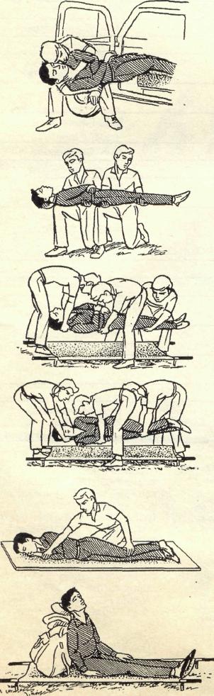 При неправильной транспортировке пострадавших может возникнуть ухудшение их состояния и развитие болевого шока. Для предупреждения такой ситуации, во время извлечения его из разбитого автомобиля или от обломков разрушенного здания, а затем укладывания на носилки с целью транспортировки – это должны одновременно делать несколько человек. При этом каждый человек, оказывающий помощь пострадавшему, своими руками совершает такой захват его тела, который наиболее подходит применительно к ситуации. На приложенном ниже рисунке указаны возможные виды захватов пострадавшего с помощью рук. Из первого рисунка видно, что в случае, когда вы оказались на происшествии один, а критическая ситуация с пострадавшим – кровотечение, прекращение дыхания или остановка сердца не позволяет дожидаться помощи со стороны – примените этот захват. Этот способ захвата способствует обеспечению свободной проходимости дыхательных путей и обеспечивает относительную неподвижность позвоночника, что очень важно в случае повреждения шейного отдела позвоночного столба. Далее на рисунке указано положение рук людей, оказывающих помощь одновременно. Они делают это так, чтобы позвоночный столб оставался прямым. В случае перелома позвоночника или травме груди пострадавшего надо уложить на твердое основание носилки или щит, но обязательно только на спину. При любой ситуации не переносите пострадавшего к носилкам, а наоборот поднесите их к пострадавшему. При получении пострадавшим тяжёлой черепно-мозговой травмы, особенно когда он находится в бессознательном состоянии, его следует уложить на бок и избегать тряски во время его переноса. При отсутствии тяжелых травматических повреждений, таких как перелом позвоночника, ребер или грудины, но пострадавший находится в бессознательном состоянии, его следует транспортировать в положении лёжа на боку или животе. Такое положение пострадавшего при транспортировке предотвращает западание языка и способствует обеспечению свободного поступления воздуха в легкие. В случае транспортировки людей после травмы или при заболеваниях, которые сопровождаются одышкой (например, при переломе грудины, астма, эмфизема легких), их перенос следует совершать в полусидящем положении. Так как лежачее положение будет способствовать усилению лёгочной недостаточности.