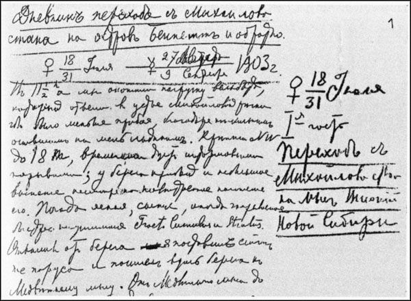 Первая страница рукописи А.В. Колчака «Дневник перехода с Михайлова стана на остров Беннета и обратно».