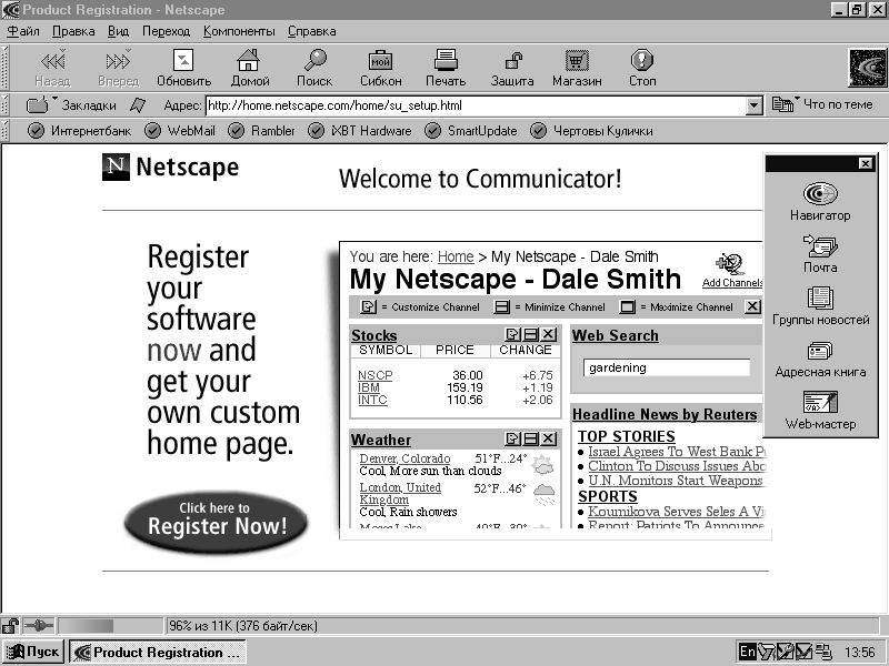 Но в марте 2000 г. фирма «Стэк» из Томска выпустила русскую версию, которая была названа Сибкон Коммуникатор 4.7 (рис. 1.4). Новый программный пакет не адаптирован, как Internet Explorer, а «собран» (фирма Netscape открыла код своей программы) с учетом интересов российского пользователя. Опыт использования новой программы говорит о том, что она имеет лучшие потребительские качества, чем продукция корпорации Microsoft. Правда, программа «тяжеловата» в работе, и поэтому требовательна к характеристикам компьютера.