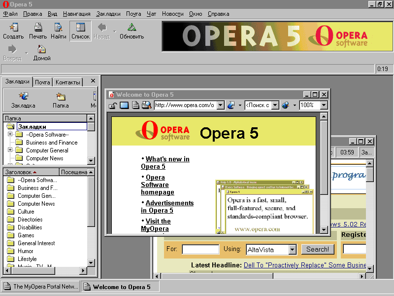 Обозреватель Opera (рис. 1.6) фирмы OperaSoftware из Норвегии является вполне достойным конкурентом американским грандам. В марте 2000 г. появилась четвертая версия, которая очень удобна в работе, а конец года ознаменовался появлением 5-й версии (бесплатной!). В начале 2001 г. на сервере фирмы предлагается локализованная для России 5-я версия.