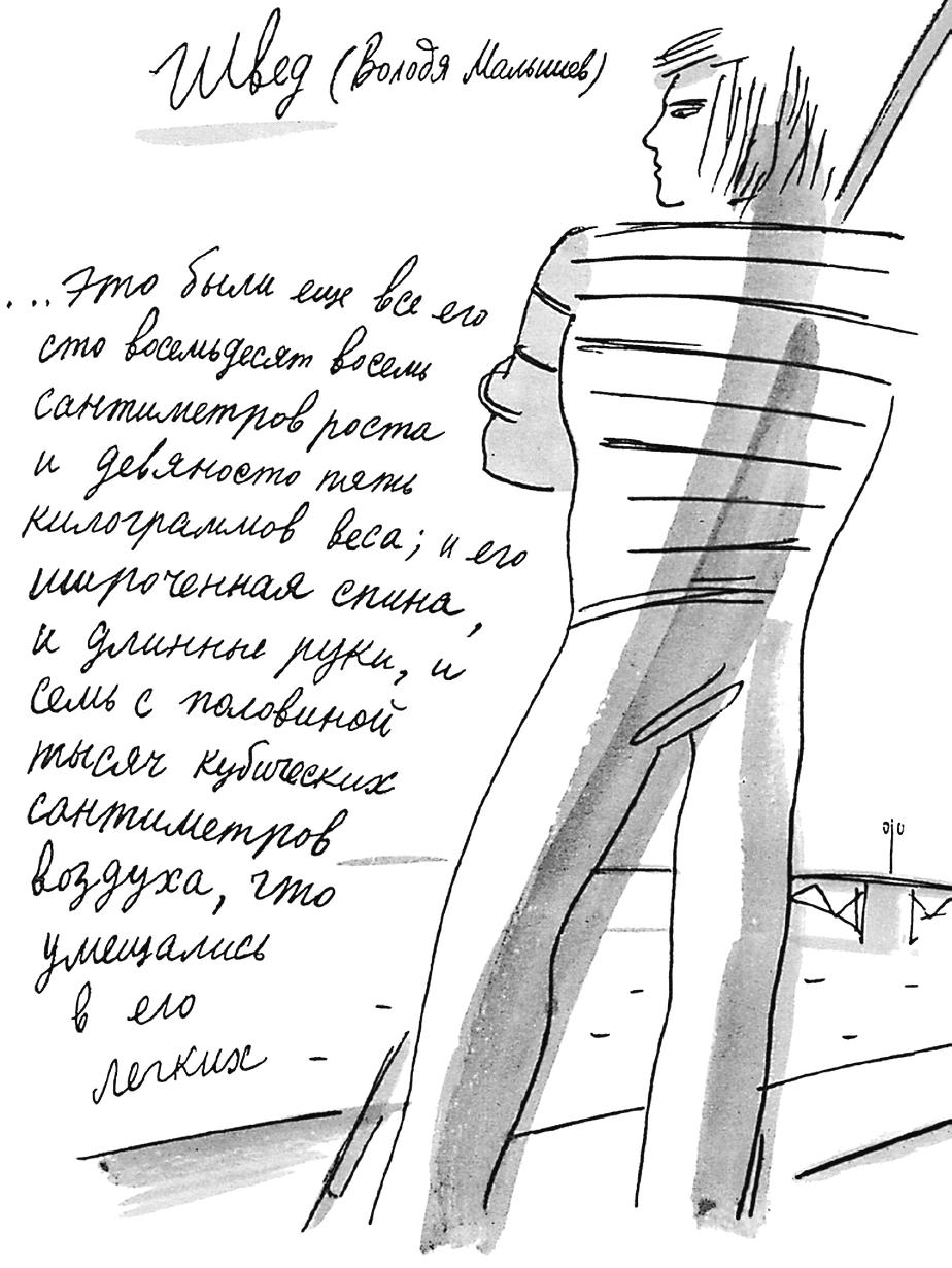 Поэтому, когда хотели сказать про Шведа, то говорили: «Вон там идёт Малышев, Швед, тот, что загребным у „бедняг“. В то время как всем остальным не полагалось ничего, кроме номера, на котором мы сидели в лодке, так что я, например, был „бедняга-пятый“, а Пончик – „бедняга-четвёртый“, и это было ужасно обидно, потому что звучало каждый раз так, словно мы все были какими-то заморышами из приюта, а не здоровыми парнями. Здоровее многих и многих, которых называли по-человечески, „карасей“, например, из безрульной четвёрки Карасёва или даже „булочек“ – из восьмёрки Булочкина.