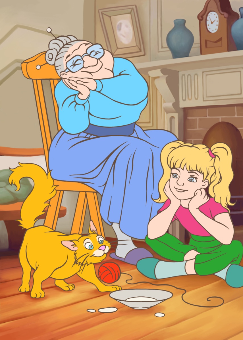 – Нет, я больше не могу терпеть! Это просто чудовище! Беги, внученька, быстрее на улицу и принеси котёнка, который сидит на приступке. Иначе мы ничем не спасёмся от этой мыши.