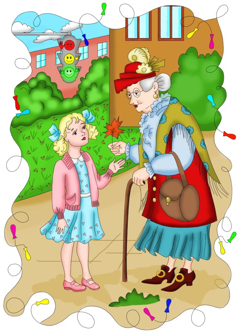 Девочка взяла в руки листочек, разглядела его: это был самый обыкновенный листочек, зелёный, чуть тронутый желтизной с одной стороны… «Странный подарок, – подумала Машенька, – всё равно надо поблагодарить!» Девочка подняла голову, но старушки уже нигде не было. Она словно в воздухе растворилась.