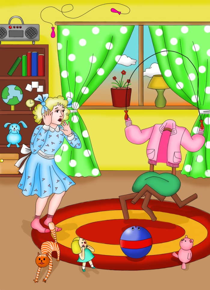 Но те скакали по всей комнате и не давались в руки. Еле-еле поймала их девочка. Отобрала у куртки скакалку, кое-как успокоила стул. А куртка так разыгралась, что никак не могла остановиться. Даже когда девочка надевала её, та всё тянула свои рукава к скакалке и вырывалась, чтобы ещё попрыгать. Пришлось повесить её на место. Тут уж куртка присмирела.