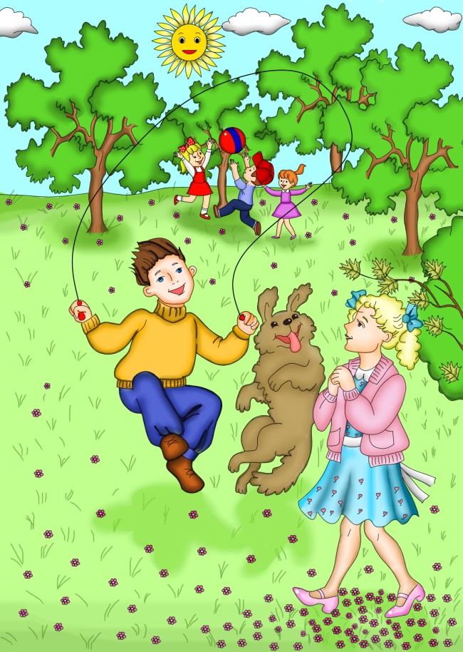«Ну что же, когда-нибудь всё равно поблагодарю», – подумала девочка и начала прыгать. Но вдруг к ней подбежала собачка, вырвала скакалку из рук и отнесла её мальчику. Тот возмутился и сказал собачке: