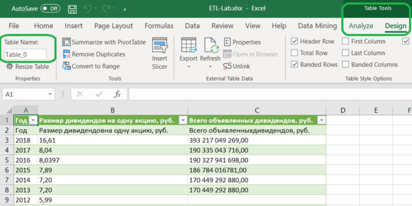 Переходим в группу Table Tools в верхнем меню ленты. Выбираем раздел Design. Проверяем название таблицы: