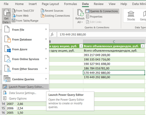 В группе Get & Transform скрывается кнопка запуска редактора запросов Power Query Editor: