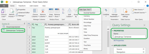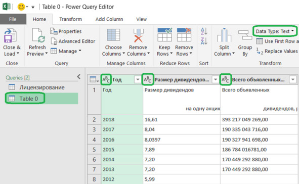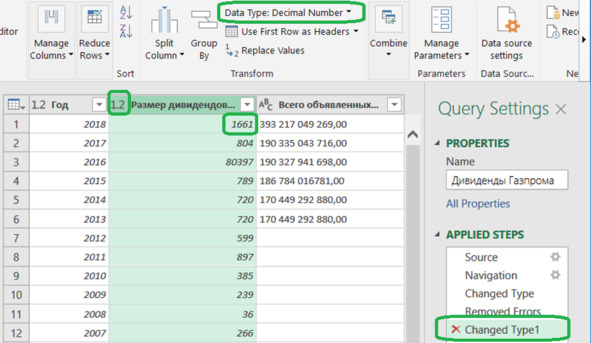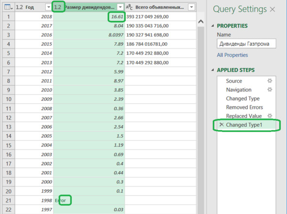 Обращаем внимание на изменение форматирования и сообщение о типе в заголовке столбца.