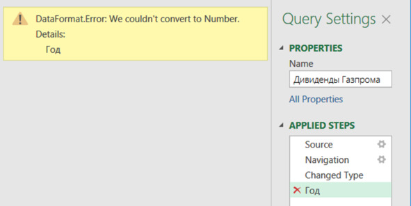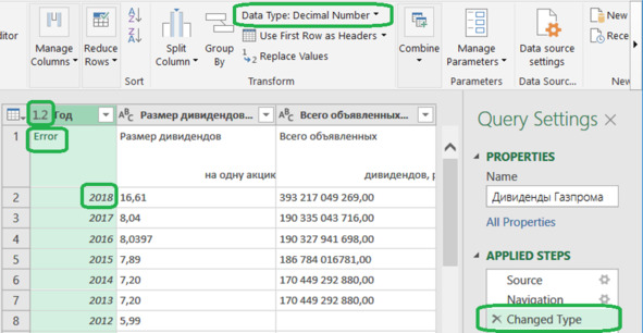 Удалим первую строку таблицы, в которой появилась ошибка преобразования типа.