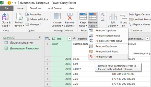 Home – Reduce Rows – Remove Rows – Remove Errors.