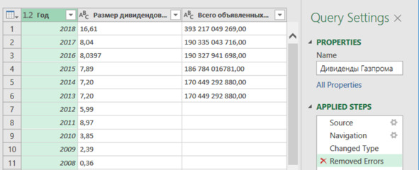 Обратим внимание на количество строк в таблице до и после удаления ошибок. Для этого мы можем откатить последний шаг, нажав красный крестик в разделе Применённые шаги. Потом снова вызываем удаление строк с ошибками.