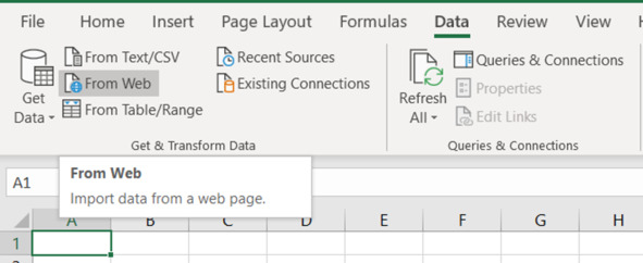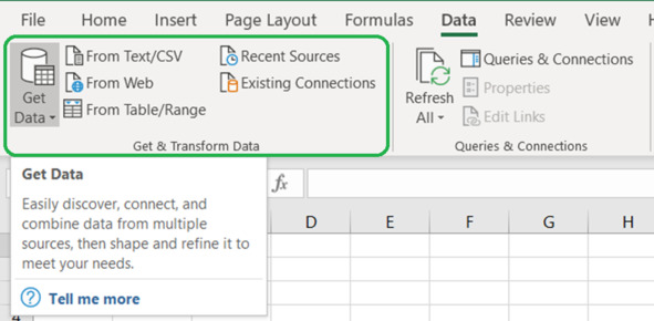 Задание. Найдите группу Get & Transform в разделе Data и изучите названия основных кнопок на ленте, а также всплывающую подсказку для кнопки Get Data.
