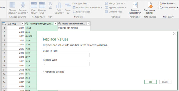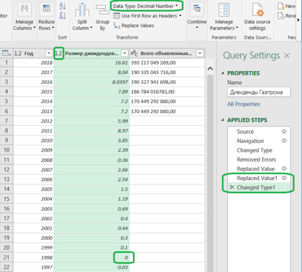 В одной ячейке за 1998 год был прочерк. Возможно, это означает, что дивиденды не выплачивались. То есть равны нулю.